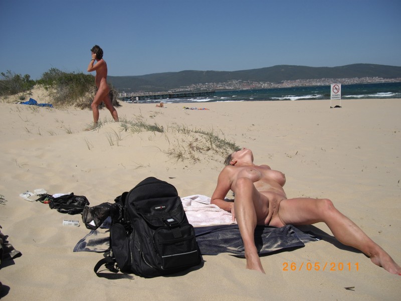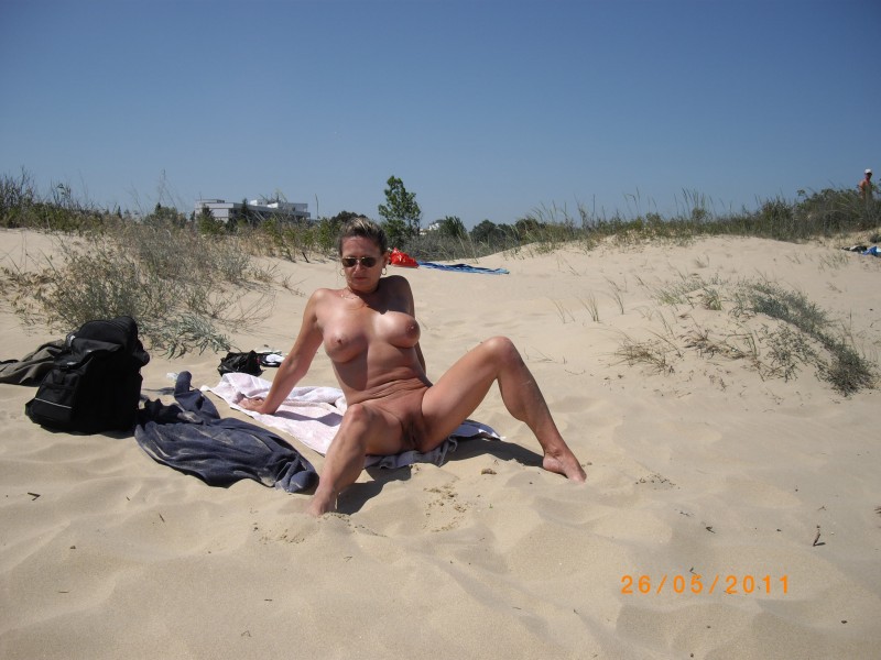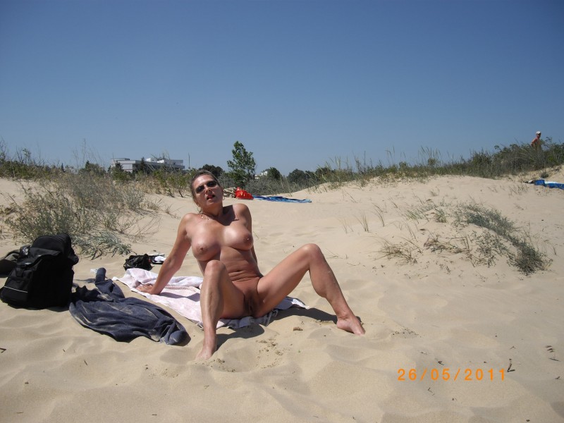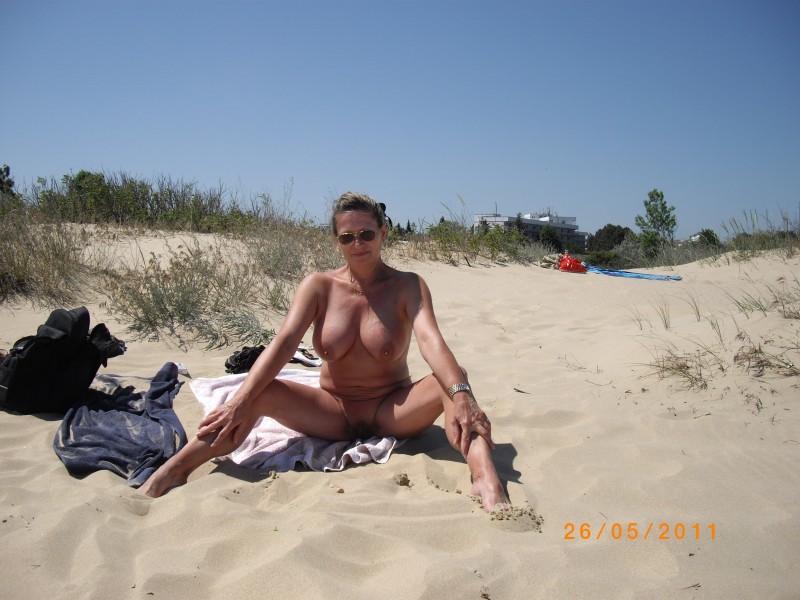 Зрелая и весьма сексуальная голая нудистка, устроившись на пляже, начинает эротично позировать и загорать под палящим солнцем. В процессе ощущая возбуждение, женщина подробнее всего демонстрировала упругие буфера и возбуждающую бритую письку с гладким лобком.
