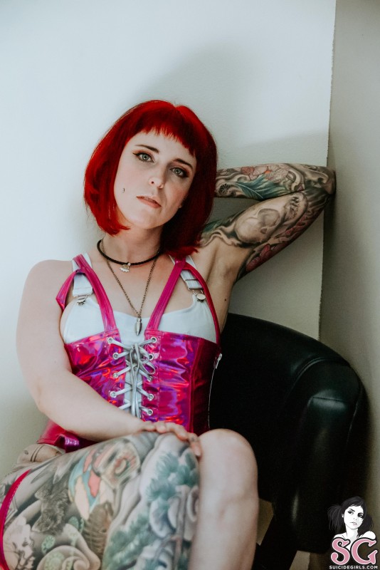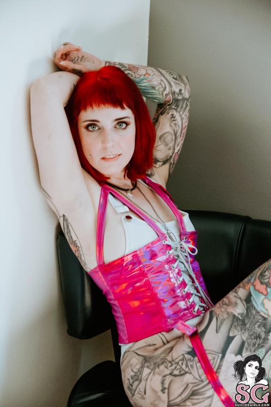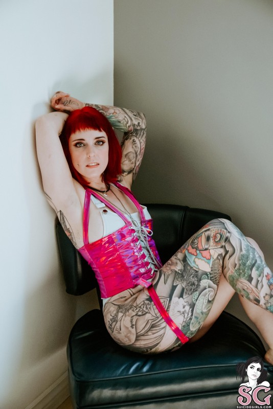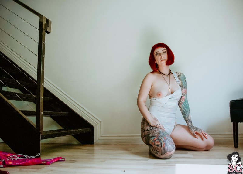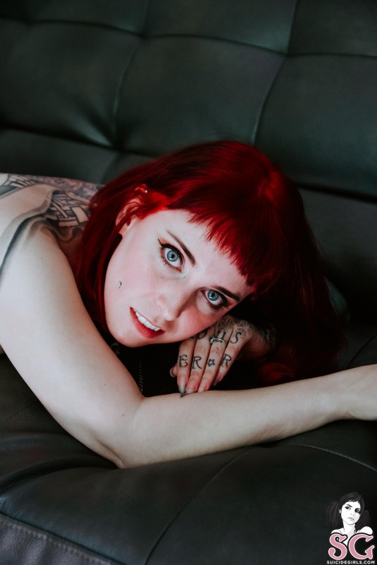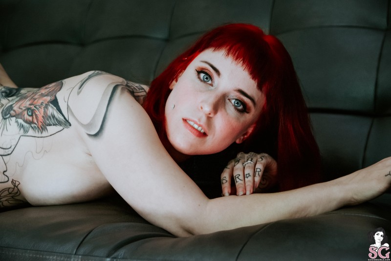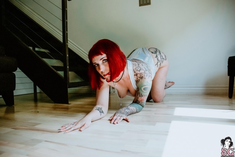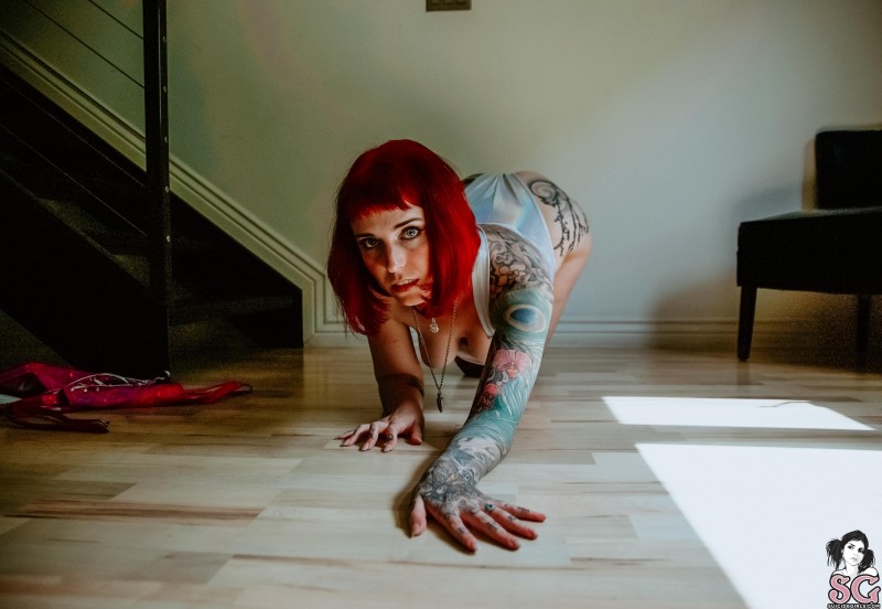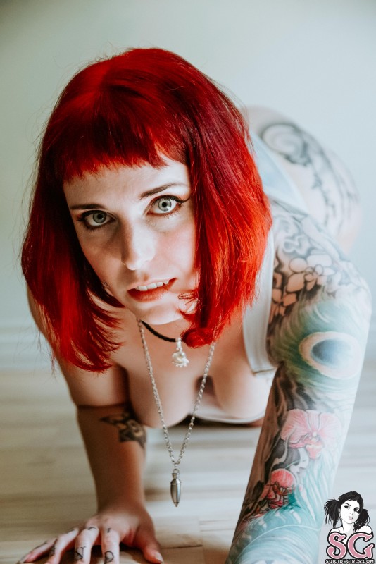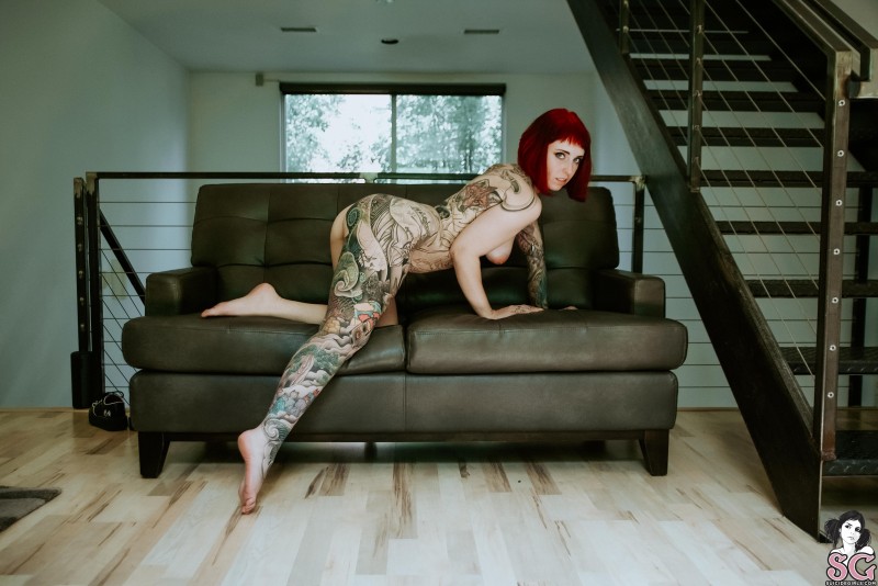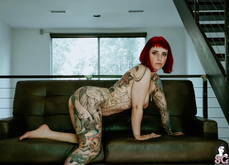 Скинув с себя все лишнее, обнаженная баба с пышными формами в татуировках эротично позирует дома и делает на себе акцент с разных сторон. Наслаждаясь, сексуальная милашка с красными локонами и маленькой грудью наиболее часто выгибала спинку раком, оттопыривая большую жопу.