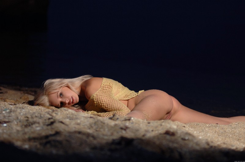 Кокетливо играясь со своей прозрачной кофточкой, молодая сочная блондинка без трусов энергично позирует на пустом пляже ночью. Чувственно извиваясь всем телом на горячем песке, сексуальная девка с натуральными упругими сиськами развратно виляет подтянутой попкой и мельком засвечивает свою бритую письку.
