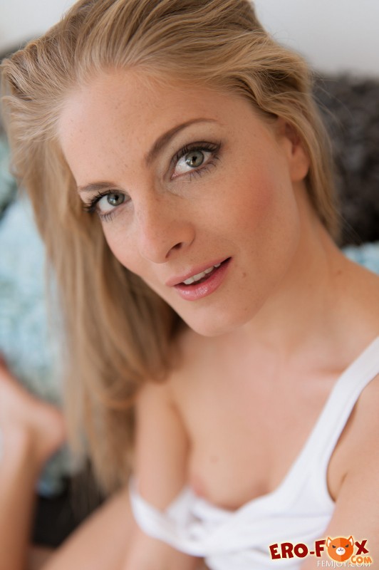 Сексуальная блондинка сняла трусики с майкой и голая лежит на диване красуясь перед камерой. Девушка без всякой скромности демонстрирует свою маленькую грудь, красивую попку с упругими ягодицами и гладко выбритую киску.