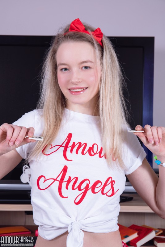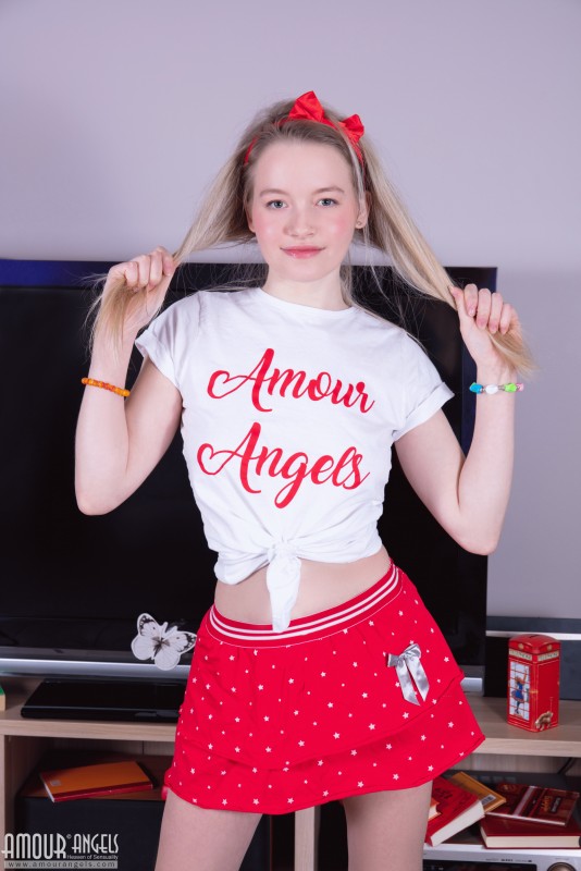 Кокетливо хлопая своими красивыми глазками и теребя на себе короткую юбочку, молодая игривая детка постепенно разделась перед камерой и, энергично позируя голышом прямо на полу, в самых выгодных ракурсов показала нам свою бритую киску с розовыми половыми губками.
