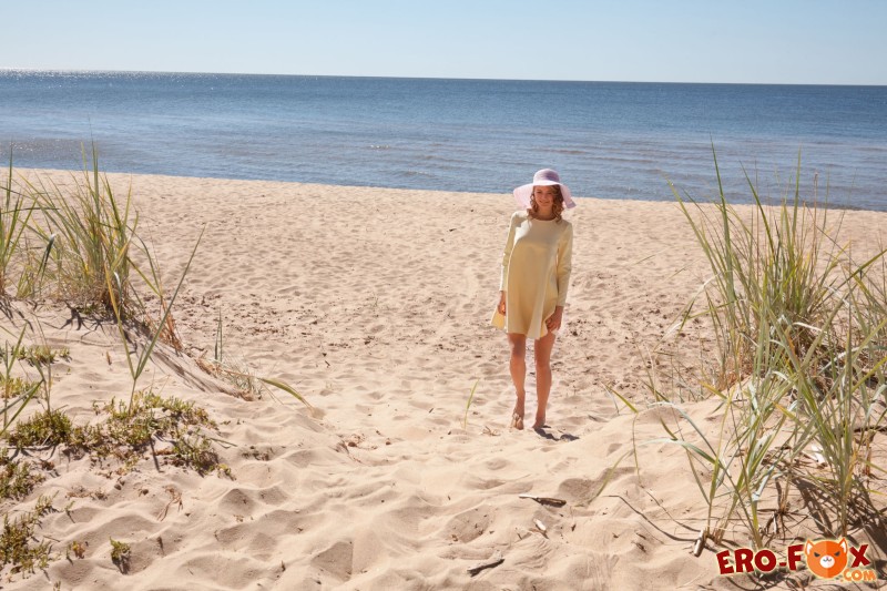 Молоденькая девушка в платье без нижнего белья, прогуливаясь по пляжу, в какой-то момент решила показать сексуальное тело, начав эротично оголятся. Вначале красотка с кудрявыми волосами оттопыривает упругую попочку, а после разворачивается натуральными сиськами с гладенькой писькой и пушком на лобке.