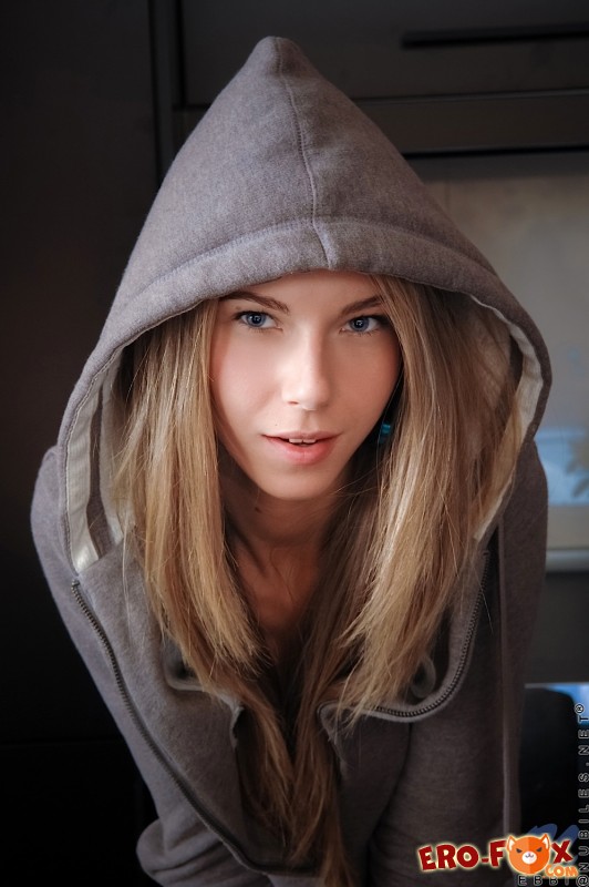 Устроившись на кухне, симпатичная голая девушка с худенькой талией в кофте толстовке, типа худи с капушёном, прогибаясь раком, начинает медленно снимать короткие шортики под которыми не было трусиков. А присаживаясь на стульчик, полуголая девица с упругой грудью нежно трогала голенькую бритую письку пальчиками давая нам возможность насладиться этим возбуждающим зрелищем.