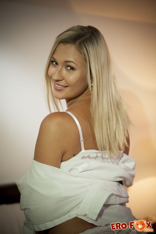 Устроившись поудобнее на кровати, привлекательная блондинка медленно скидывает белое нижнее бельё и начинает засвечивать бритую письку, для этого раздвигая промежность лежа на животе. В процессе молодая девушка с маленькими сиськами и возбужденными сосками, мило улыбаясь, продолжала чередовать позиции, порой оттопыривая сочную попку.