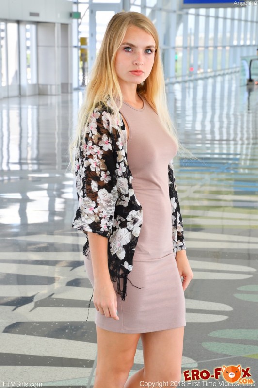 Гуляя по зданию, красивая блондинка в один момент медленно скидывает облегающее платье и оставшись только в кроссовках продолжает начатое. Таким образом, полностью раздетая сексуальная девушка с упругой маленькой грудью, подробно демонстрирует гладкий лобок с бритой писькой и сочные ягодицы.
