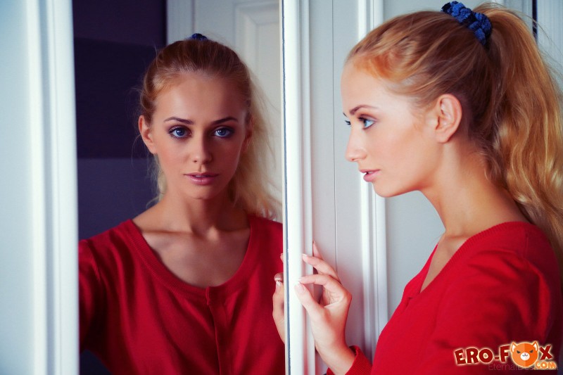 Перед нами красивая блондинка с пышной грудью, из одежды на ней только красная кофта расстегнутая нарастопашку. Стройная девушка красуется перед камерой и демонстрирует свои прелести. У неё не только шикарная грудь, но и приятное личико, упругая попа и соблазнительная бритая киска.