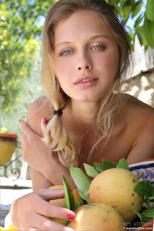 Прикрываясь большим платком, белокурая и полностью голая девка с худенькой талией красуется перед фотокамерой в саду под апельсиновым деревом и показывает себя со всех сторон. А вставая на коленки и прогибаясь раком, сексуальная стройняшка с маленькой грудью засвечивала притягательную киску и упругую задницу.