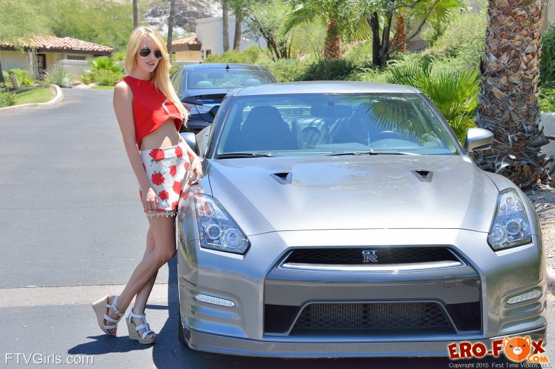Сексуальная блондинка гуляла по улице и прямо там задрала свою короткую юбку продемонстрировав что она без трусов под ней. Девушка ничуть не стесняется посторонних взглядов и увлекаясь позированием перед фото камерой предстаёт перед нами в разнообразных возбуждающих позах. Она охотно показывает свою бритую письку, красивую упругую попку и другие прелести. так же красавица успевает сфотографироваться рядом со спорт каром.