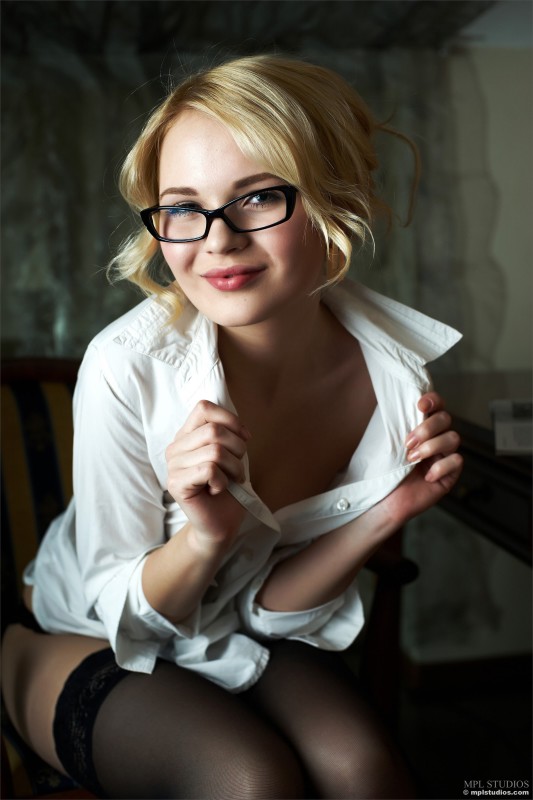Весьма симпатичная белокурая девица в очках и черных чулках возбуждающе позирует перед камерой и очень скоро снимает с себя рубашку и трусики. Оказавшись же голой, сексуальная блондинка с плоской грудью устраивается на стуле, где стоя на коленках акцентирует внимание на попке с бритой писькой.