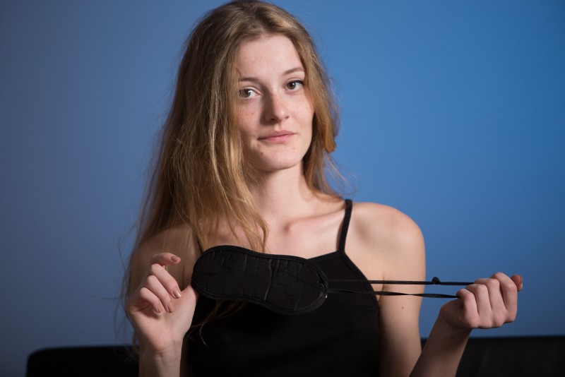 Тощая девка с повязкой на глазах