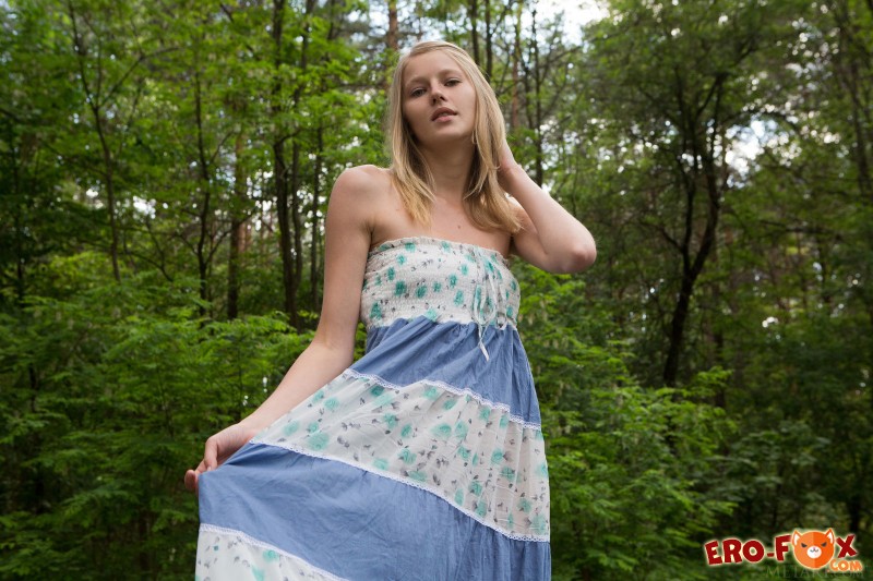 Обворожительная деревенская девушка раздевается перед фото камерой обнажая своё упругое тело. Блондинка снимает лёгкое ситцевое платье и открывает нам чудесный вид на свои упругие сиськи с маленькими сосками, хорошенькую попку и притягательную бритую киску, от которой сложно оторвать взгляд...