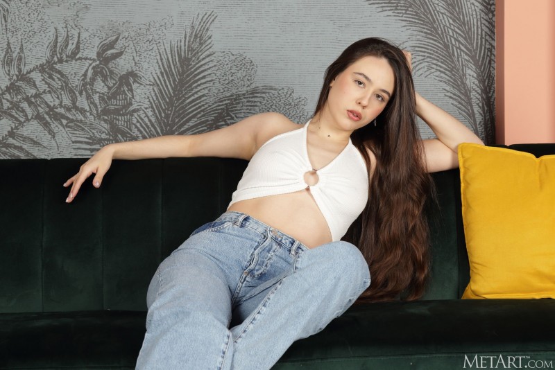 Бесстыже красуясь перед нами своими формами, аппетитная баба в обтягивающий джинсах эротично стянула их вниз по длинным ножкам и оголила свою крепкую задницу, а затем ложится обнаженной на диван и интригующе засвечивает между сжатыми бёдрами сочную бритую письку.