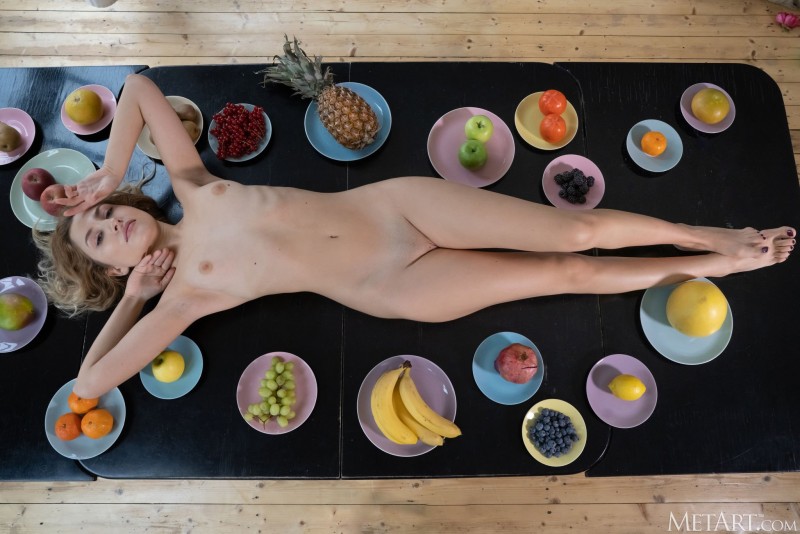 Медленно сняв с себя красивое кружевное белье и во всей красе выставив на показ свое сексуальное тело, голая разгоряченная телка с натуральными сиськами эротично позирует перед нами на столе с едой и с разных ракурсов выпячивает то аппетитную попку, то бритую сладкую киску.