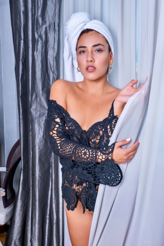 Выйдя после ванны и не успев даже хорошенько высохнуть, разгоряченная барышня бесстыже оголяется перед работающей камерой и во всей красе демонстрирует свое сочное тело. Страстно прогибаясь в эротичных позах, сексуальная телка с маленький грудью и большой попой возбуждающе ласкает себя в разных чувствительных местах и мельком засвечивает между аппетитными бёдрами свою бритую письку.