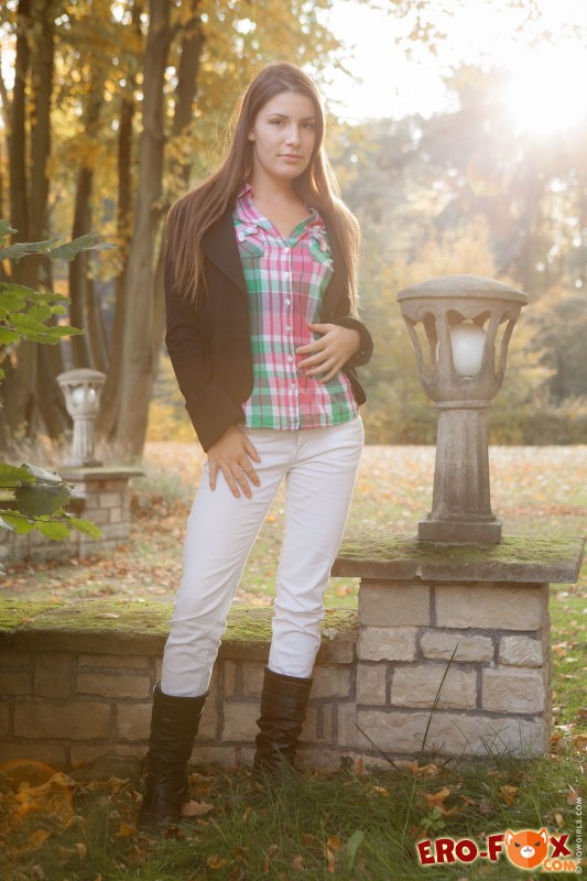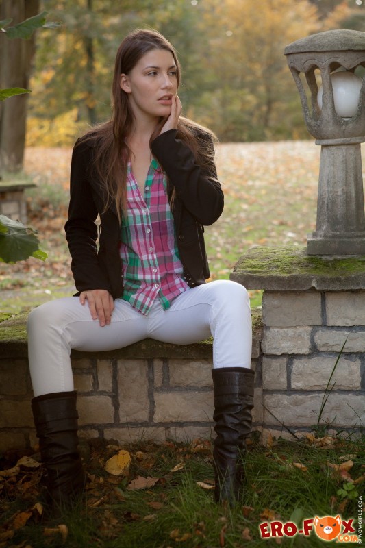 Сексуальная девушка с упругим телом разделась до гола в городском парке и в таком виде позирует перед фотокамерой. Сперва красавица стянула с себя пиджак с рубашкой, а затем белые джинсы со стрингами и оказавшись совершенно голой принялась демонстрировать прелести. Она показала маленькую грудь, красивую попку с подтянутыми ягодицами и гладко выбритую письку.