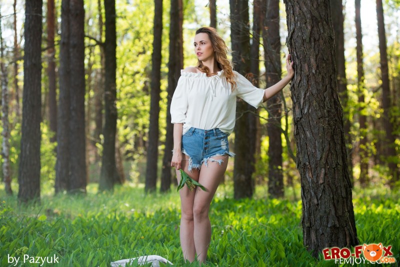 Привлекательная девушка в белой блузке и коротеньких джинсовых шортах, принимается позировать в лесу. В какой-то момент она берется медленно раздеваться. Вначале красотка демонстрирует упругую грудь, с возбужденными сосками, а после показывает сексуальную попку и бритую киску с волосиками на лобке.