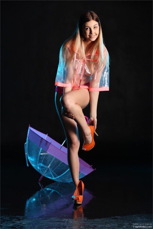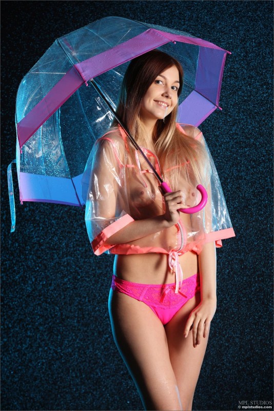 Вооружившись зонтиком и надев розовые трусики с прозрачным дождевиком, сексуальная модель с худенькой талией эротично позирует в фото студии. Меняя ракурсы, возбужденная девушка засвечивает маленькие сиськи, а стягивая остатки нижнего белья показывает бритую письку с гладким лобком.