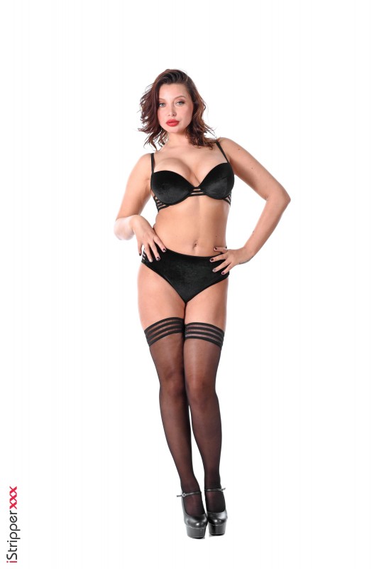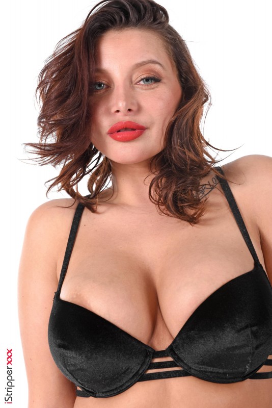 Украсив себя ярким макияжем, губастая дамочка снимает сексуальное бельё и остаётся перед нами в одних только чулках, хвастаясь при этом смачными титьками, явно не натурального происхождения. Через пару мгновений в руках у модели появляется дилдо, который она крепко сжала между больших доек и не расстаётся с ним до конца съёмки.