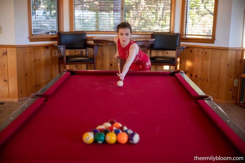 Сидя перед камерой на бильярдной столе и эротично натирая длинный кий, роковая красотка с голой сочной задницей развратно позирует в откровенном красном наряде, возбуждающе выпячивая в разных позах свою натуральную упругую грудь и мельком засвечивая свой нежный бритый лобок.