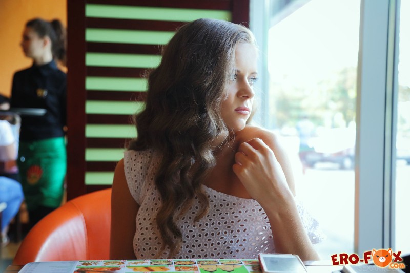 После обеда в ресторане молодожёны пошли к себе домой, где молодая жена снимает лёгкое платье и совершенно голая передстаёт перед объективом фотокамеры и демонстрирует своё упругое тело. Но заигрывать со своим мужем красавица начала ещё сидя за столиком в кафешке, где широко раздвигала свои стройные ножки под столом, чем показывала полное отсутствие трусиков и красивую бритую киску под юбкой...