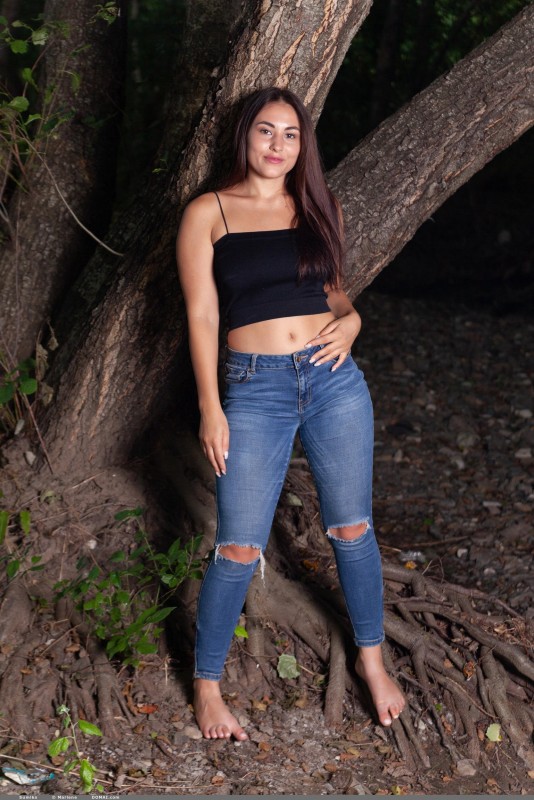 Тётка с голыми сиськами снимает джинсы в лесу