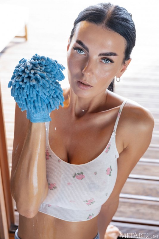 Быстро избавившись от одежды, грудастая потаскуха развратно позирует голой у большого окна и одновременно моя его мокрой тряпкой. Вся облившись водой, сексуальная брюнетка не стесняется показать себя во всей красе и с высоко задранными ногами светит в промежности бритой писькой.