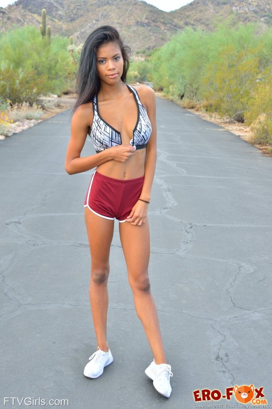 Спортивная чернокожая девушка в коротеньких шортиках и топике, выйдя на пробежку, захотела немного попозировать и продемонстрировать стройное тело. Добравшись до парка, красотка снимает верх, и засвечивает упругие сиськи средних размеров, с возбужденными сосками.