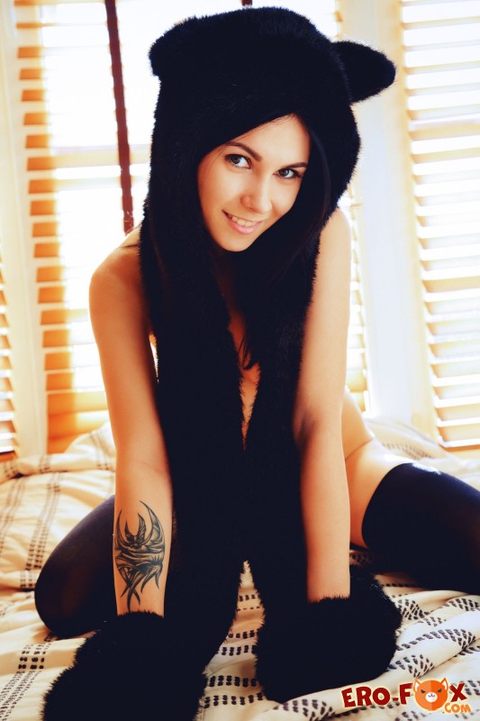 Молоденькая девушка со стройным телом и маленькими сиськами, нарядилась в экстравагантную шапку с кошачьими ушками и черные чулки, улеглась в постели, и начала ласкать себя леденцом. Молодая брюнетка раздвинула ножки, стараясь прикасаться мокрой конфетой к бритой киске, пробуждая в своём нутре мощную волну возбуждения.