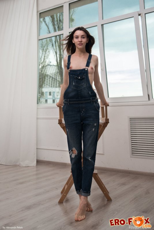 Худощавая девушка одела комбинезон на голое тело чтобы в последствии эротично снять его перед фото камерой. Милашка заигрывая с нами и фотографом скидывает с себя джинсовый комбинезон и обнажает перед нами своё тело со всеми его прелестями. Модель кокетливо показывает маленькие сиськи, упругую попку и бритую письку, ничуть не смущаясь камеры и постороннего взгляда.