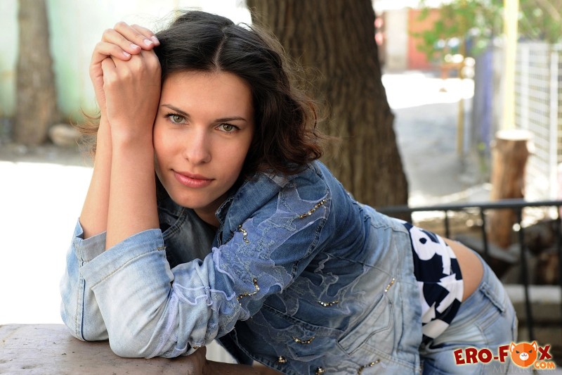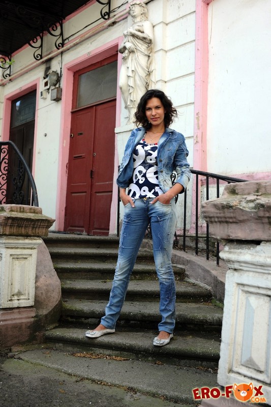 Симпатичная девушка с достаточно крупной натуральной грудью, гуляя на улице в джинсовом костюме, уже спустя несколько минут медленно раздевается, подробно показывая сексуальное тело и волосатый лобок. В процессе съёмки длинноногая крошка так же не забывает поворачиваться спиной, выставляя на показ подтянутые ягодицы, и животиком демонстрируя соблазнительную киску.