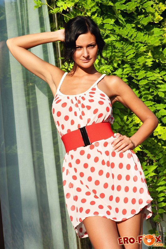 Устроившись на улице рядом с домом, страстная жгучая брюнетка без трусов и лифчика, соблазнительно позируя перед фотокамерой, медленно сняла платье в горошек, постепенно обнажая сексуальное тело и все его прелести. В процессе съёмки девушка нежно трогала себя руками и подробно демонстрировала нам свои натуральные сиськи большого размера, а так же полностью выбритую письку.