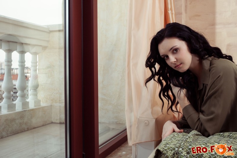 Располагаясь в постели рядом с окном, привлекательная брюнетка с вьющимися локонами волос и упругими дойками, стоя на коленках начинает медленно раздеваться, стягивая блузку и короткие джинсовые шорты. Оголившись, стройная молодая девушка легла на спину и раздвинула ноги, демонстрируя бритую письку и соблазнительный лобок.
