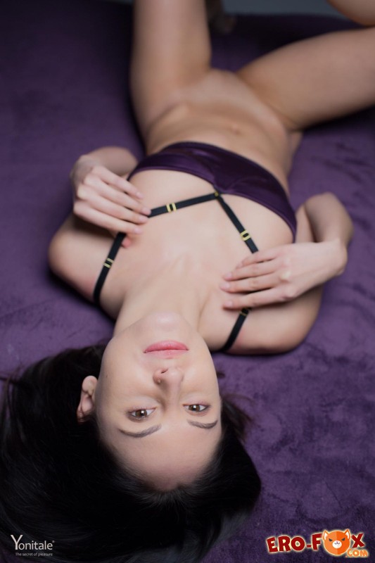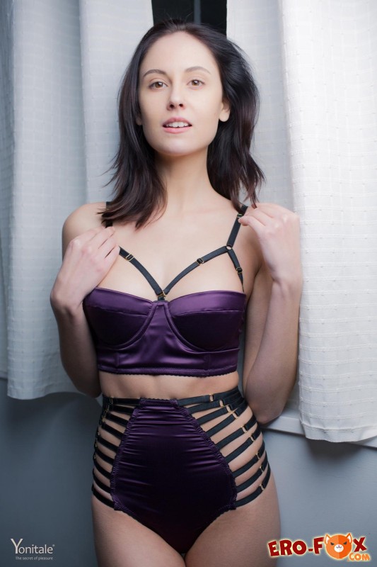 Располагаясь у окна, привлекательная брюнетка в красивом нижнем белье начинает эротично позировать, ощущая удовольствие. В будущем перебираясь на кровать и становясь на коленки, темноволосая девушка все же берется медленно раздеваться, в процессе ложась на спинку и показывая упругие сиськи с торчащими сосками, а так же бритую письку.