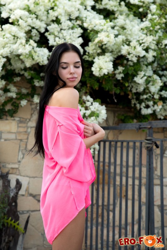 Немного прогулявшись по улице и эротично попозировав в блузке и трусиках, худенькая брюнетка со стройной фигурой и маленькими сиськами возвращается домой и продолжает начатое в постели, раздеваясь догола. А прогибаясь раком и нежно трогая себя руками, красотка показала нам попку и волосатую киску с интимной стрижкой.