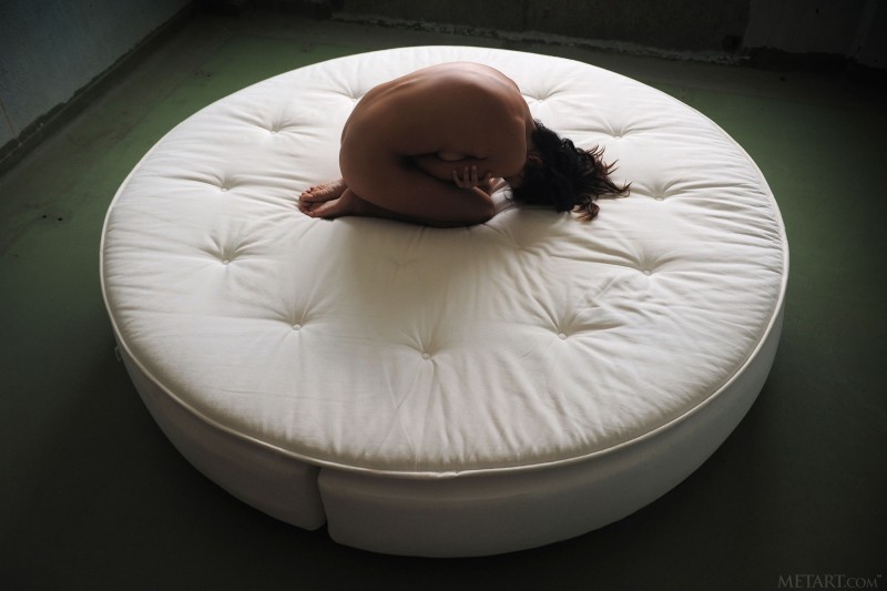 Устроившись на круглой кровати, невероятно страстная молодая девица с худенькой спортивной фигурой, эротично меняя разные ракурсы, медленно стягивает пеньюар и черные чулки. Оголившись полностью, стройная брюнетка широко раздвигает ноги и подробно демонстрирует бритый лобок с писькой, а так же маленькую грудь.