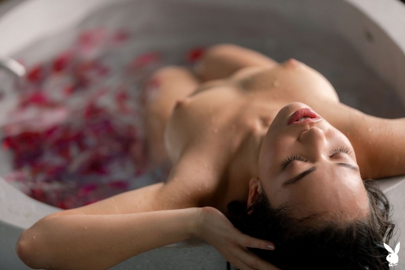 Сексуальная красотка с худенькой талией в кружевных трусиках и лифчике начинает эротично позировать в ванной, в процессе оголяясь и забираясь в воду. Нежно поглаживая себя руками и часто меняя ракурсы, стройная девушка с плоскими сиськами ощущала удовольствие и подробно демонстрировала мокрую попку и бритую письку.