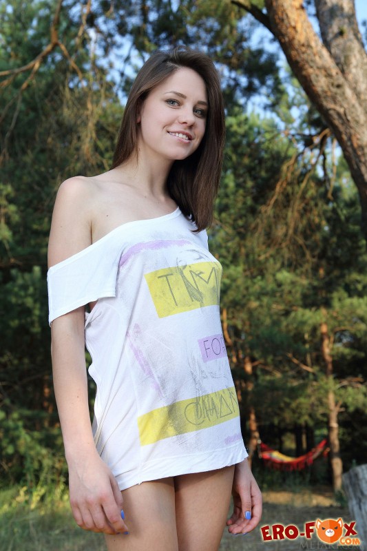 Молодая привлекательная девушка разделась и голая позирует в лесу перед фотокамерой. Девушка демонстрирует своё восхитительное упругое тело, не стесняется показать бритую письку крупным планом и другие прелести.