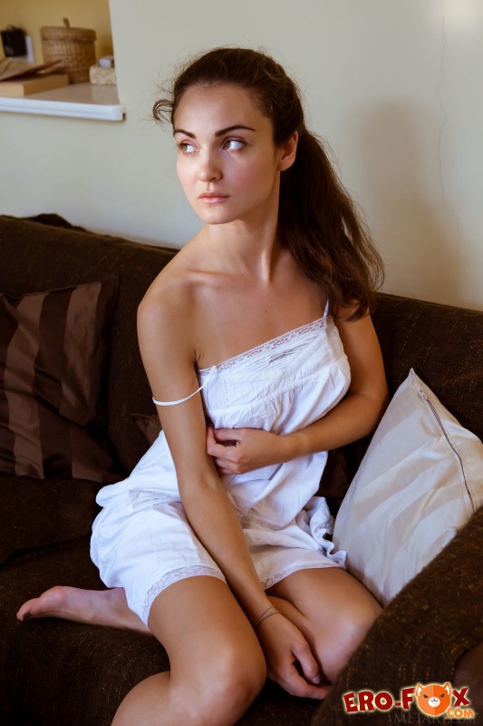 Обольстительная девушка снимает белую ночнушки и оказавшись голой перед камерой начинает всячески красоваться принимая различные позы и демонстрировать своё упругое тело. И всё в этой брюнетке прекрасно, вот только попку бы подкачать...