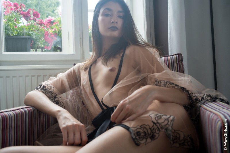 Сидя дома в кресле, стройняшка с накрашенными губками и плоской грудью, накинув на голо тело легкий халатик, эротично позирует и вытягивает длинные ноги в туфлях. В дальнейшем сексуальная девушка все же разделась и меняя ракурсы сделала акцент на гладко выбритой письке.
