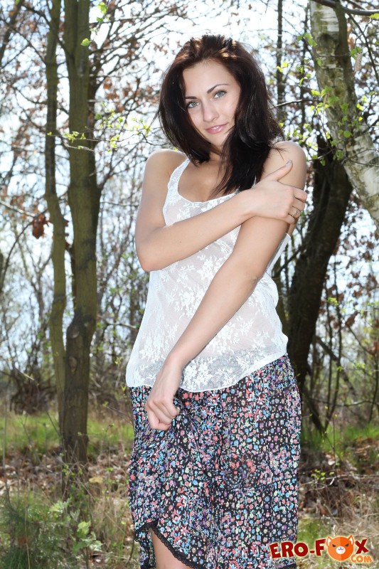 Очень красивая девушка с симпатичным личиком разделась в лесу и показала своё упругое молодое тело. У брюнетки отличная фигурка и когда она снимает юбку с майкой мы можем в этом удостовериться. Чего только стоят грудь и попка красавицы. Вот бы хоть раз прогуливаясь по лесу встретить там такую красавицу, вот это была бы удача...