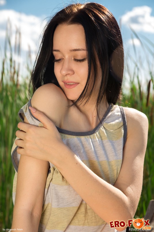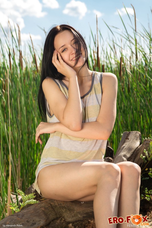 Сексапильная голая брюнетка позирует перед камерой на природе. Красавица расположилась на старом пне, который наверняка рад ощущать на себе упругую попку сочной милашки...
