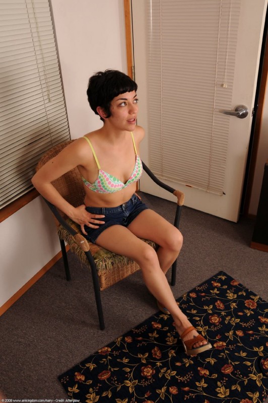 Присаживаясь дома на стуле и медленно раздеваясь, жаждущая приключений брюнетка с короткой прической, пытается нас соблазнить через объектив фотоаппарата и показывает волосатую письку, встав раком и облокотившись на кресло. Не скрывая нахлынувших на неё эмоций, страстная дамочка так же продемонстрировала маленькие сиськи и тощую жопу.