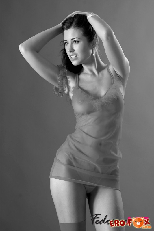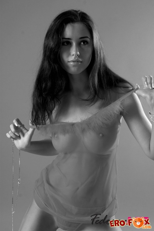 Привлекательная, обнажённая девушка на фото чёрно-белого цвета демонстрирует нам свою природную красоту. У девушки шикарное тело, красивое личико и упругая грудь с милыми сосками. Смотреть на эту девушку одно удовольствие, а чёрно-белые цвета придают ей интриги.