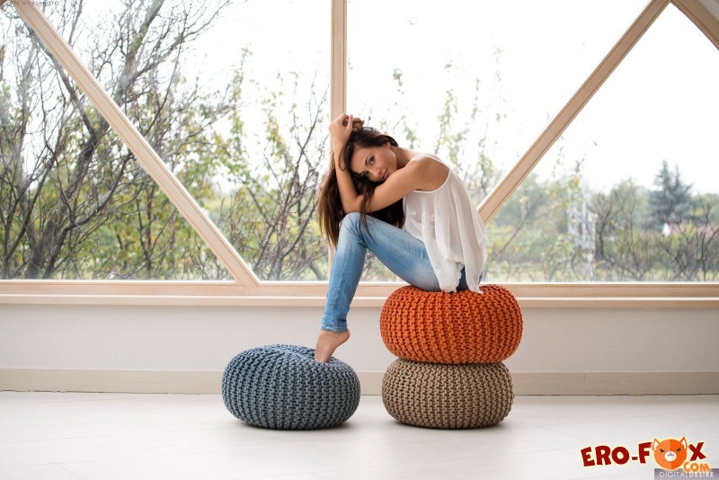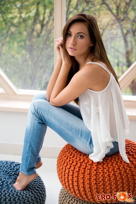Сексуальная девушка снимает джинсы, а под ними она без трусов. Таким образом красивая брюнетка остаётся голая, обнажая перед камерой упругую попку, красивую киску и классные титьки.