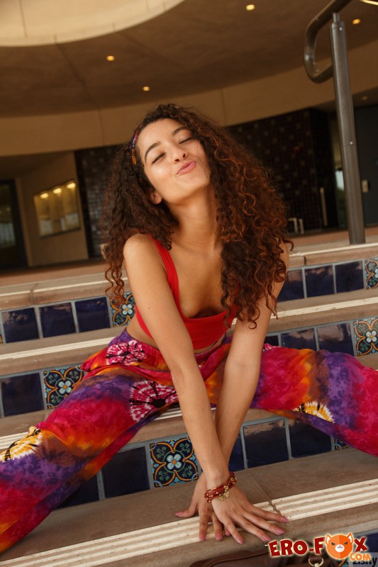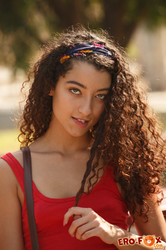 Смуглая девушка с кучерявыми волосами, прогуливаясь по улице, начала засвечивать невероятно красивую и в упругую попку. Выбирая подходящие места, милашка стягивала штаны и оставаясь в трусиках эротично позировала. Так же в процессе ей удалось засветить маленькие сиськи.