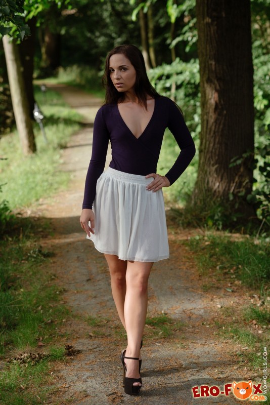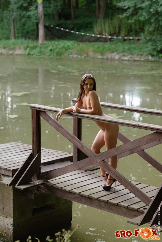 Нарядившись в привлекательный боди и юбку, стройная красотка прогуливается в лесу, а остановившись у озера нона эротично разделась перед фото камерой. Сперва девица показала маленькие сиськи, а раздевшись полностью засветила бритый лобок с татуировкой. В таком виде милашка продолжила красоваться на фоне живописной природы.