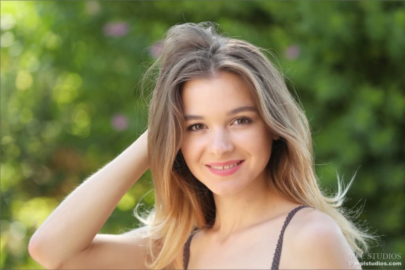 Начиная эротично позировать на лавочке во дворе, привлекательная девушка с подкаченными ягодицами в нижнем белье ощущает возбуждение и мило улыбается. В какой-тот момент сексуальная красотка с маленькой грудью все же раздевается догола и раздвигая промежность, поджимая коленки, засвечивает бритую письку с гладким лобком.