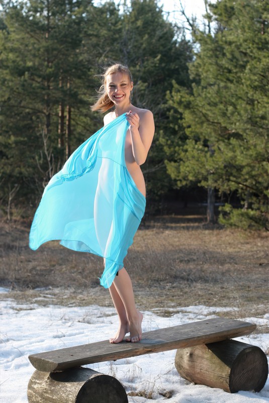 Без стеснения выйдя на улицу абсолютно без одежды, голая деревенская девушка игриво прикрывает себя прозрачной тканью и мельком светит своими маленькими титьками с острыми сосками. Не боясь холода, развратная девица соблазнительно виляет аккуратной упругой попой и, в разных позах раздвигая стройные ноги, показывает нам свою бритую пизду с прической на лобке.