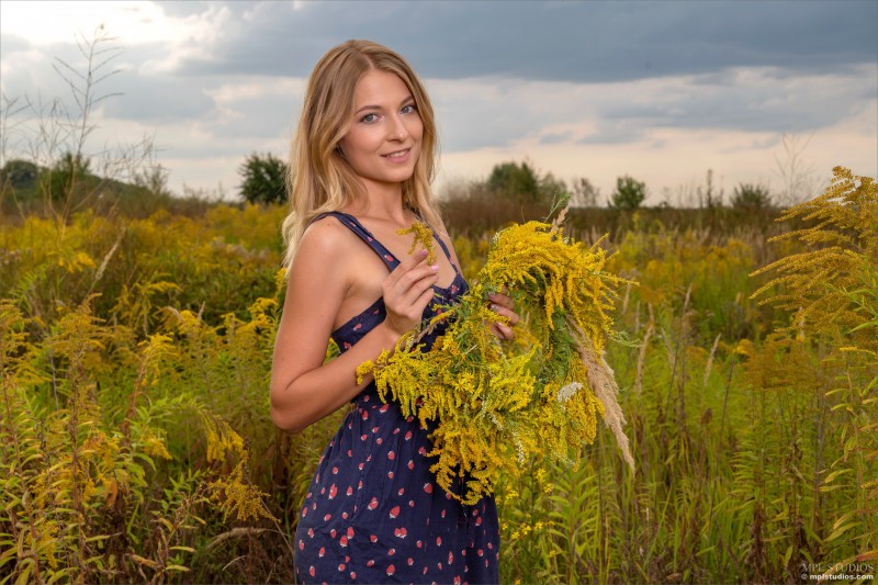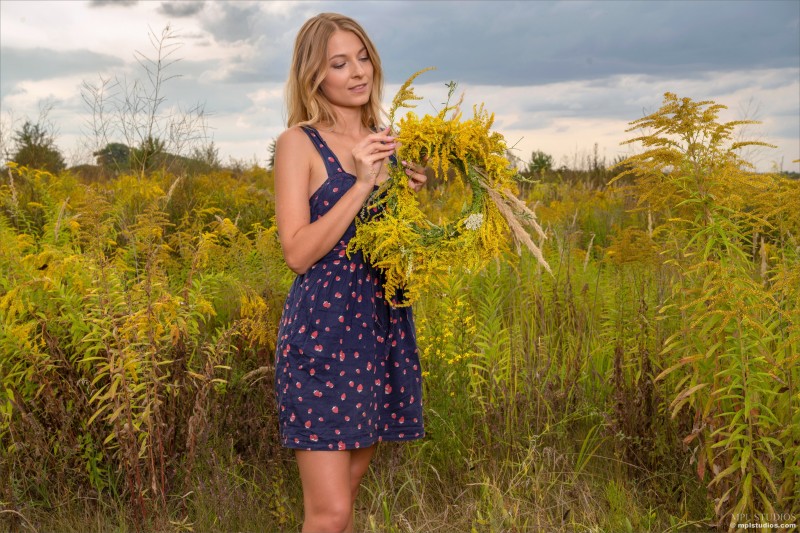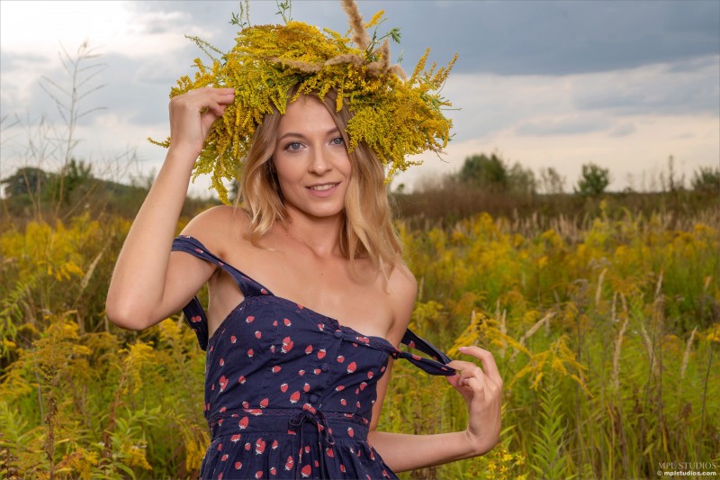 Кокетливо задирая перед камерой свое короткое платье без трусов, развратная деревенская телка с сочной жопкой постепенно раздевается до гола в поле и, светя своими маленькими сиськами, в разных позах демонстрирует нам свою раскрытую промежность с бритой пиздой.