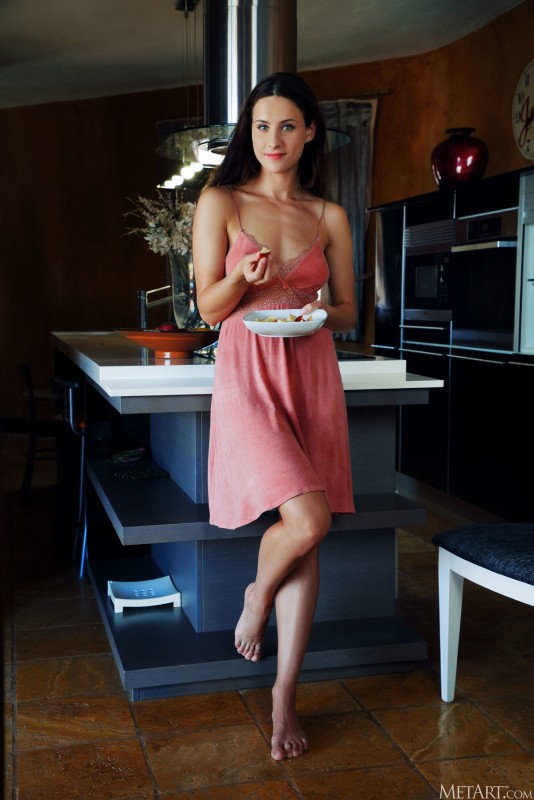 Соблазнительно медленно сняв с себя легкое платье без нижнего белья и выставив на показ упругие сиськи и задницу, развратная голая жена бесстыже позирует на кухне перед мужем, умело соблазняя его на на жаркий страстный секс на столе, и крупным планом подставляя уже готовую влажную письку.